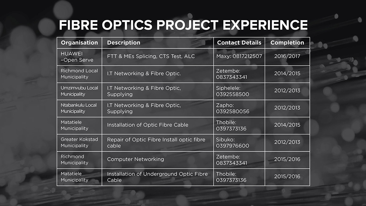 ZMK Enterprise has since the beginning of 2017 entered the market of Fibre Optic Installation in Southern Africa. Through our compliment of skilled and qualified personnel we have been able to execute projects for Telkom and Huawei in the East Coast region. Our Team Leaders are trained and tested by Huawei South Africa and have detailed knowledge of Telkom specifications that are used as a norm in the industry.
